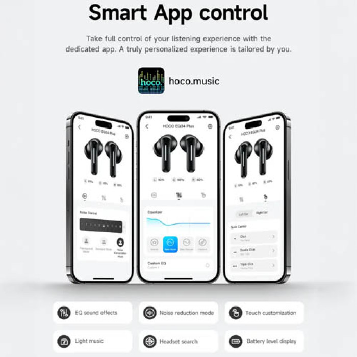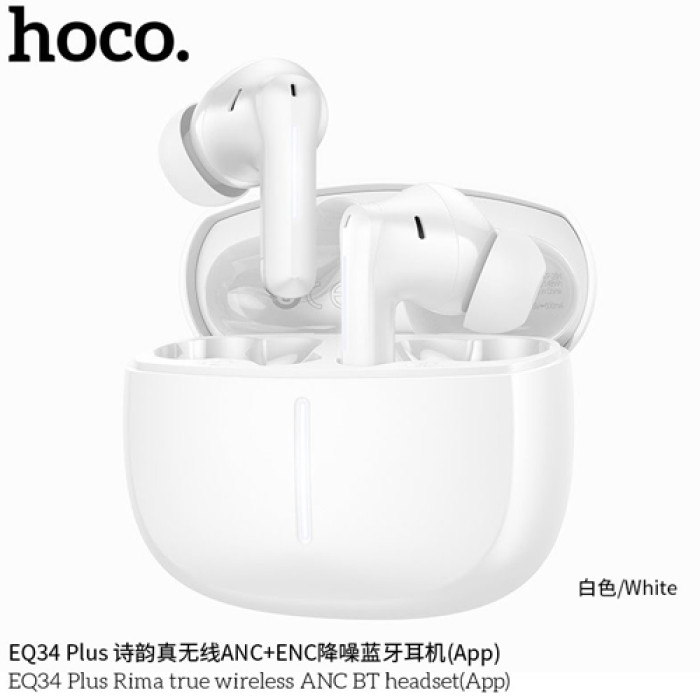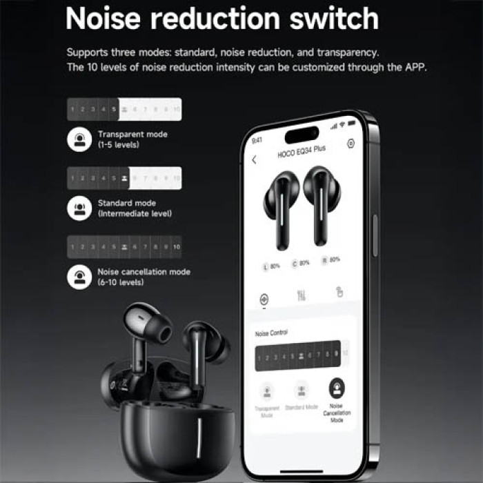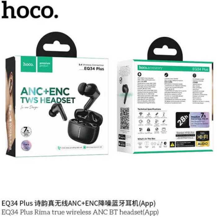 - The Hoco EQ34 Plus Wireless Earbuds offer a premium audio experience designed for modern users who value comfort, clarity, and advanced features. With Hybrid Active Noise Cancellation (ANC), these earbuds block up to 90% of surrounding noise, allowing you to enjoy your music, videos, and calls without distractions. Moreover, you can easily switch between ANC, Transparency, And Normal Modes, ensuring the perfect listening environment for every situation.